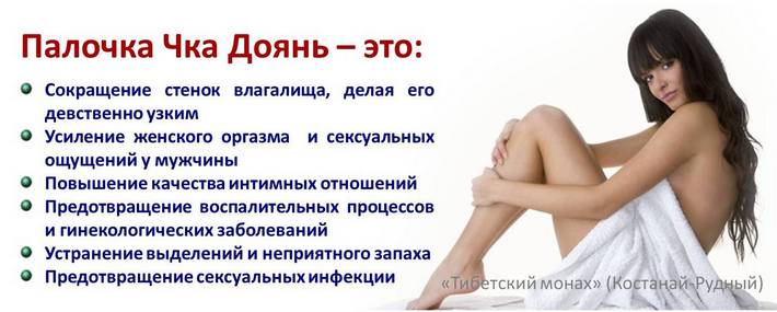 Паличка скорочує піхву жінки, роблячи його незаймано вузьким, стимулює жіночий оргазм і сексуальні відчуття в чоловіка, у такий спосіб покращуючи сексуальне життя обох партнерів. З паличкою Чоку Доянь ви швидко повернете колишні яскраві відчуття від сексуального життя, оргазм собі і своєму партнерові!