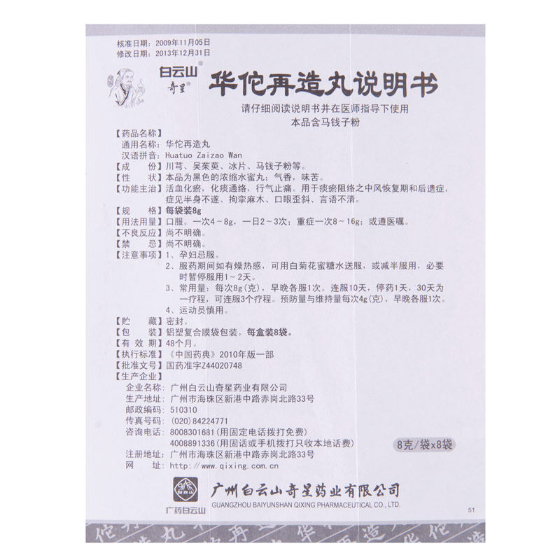 Болюси "Хуато Цзайцзао" (Huatuo Zaizao Wan) - ефективне засіб традиційної китайської медицини, використовується для лікування паралічу на тлі кровопідтеків або закупорювання каналів і колатеральних судин флегма-вологою, оніміння й судоми, паралічі лицьового нерва, глосолії.