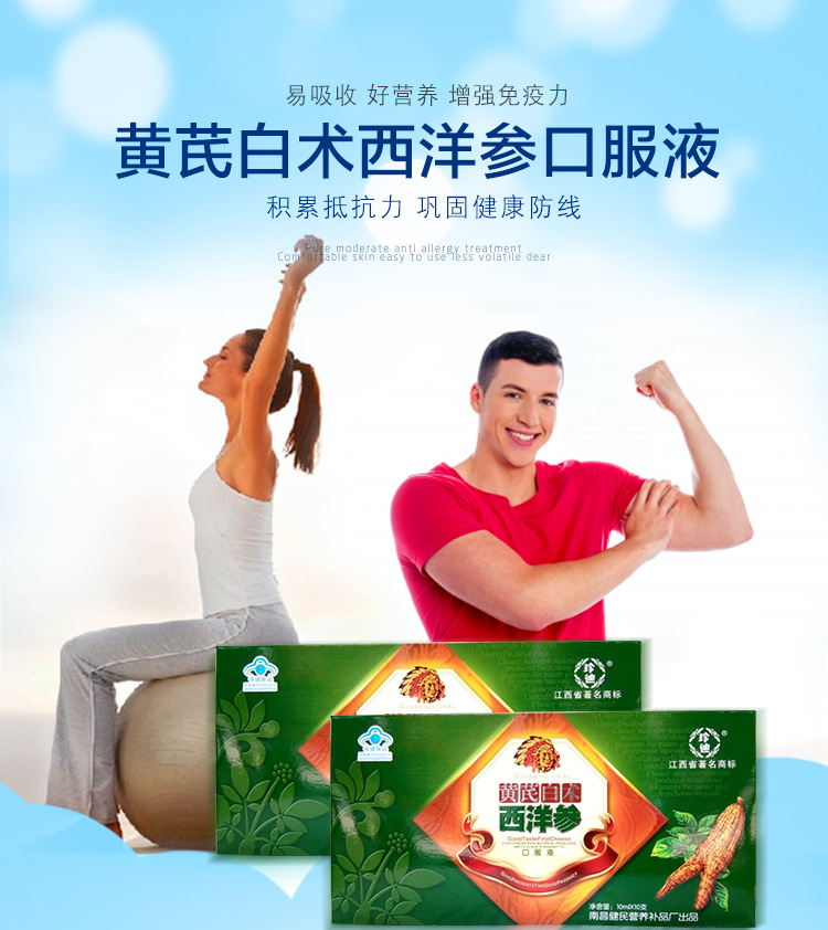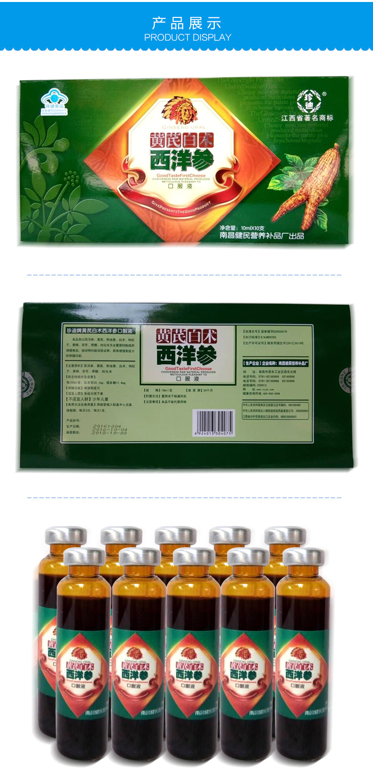 Цей продукт являє собою здорову їжу, зроблену з женьшеню, астрагала, ременії, атраклодів, мушмули, полігонату, кокосової порії, сахарози, очищеної води як основна сировина, підтверджена функціональними тестами тварин, з покращою здоров'я функцією підвищення імунітету.