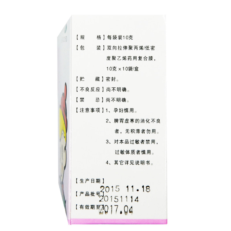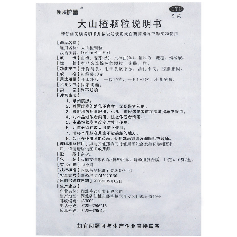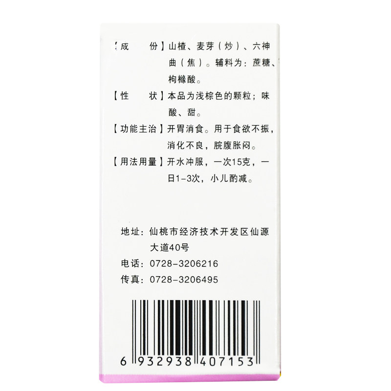 Склад: плоди глоду (shan zha), лікарські дріжджі (liu shen qu), обсмажені сходинки пишини (shao mai ya), мед (feng mi).