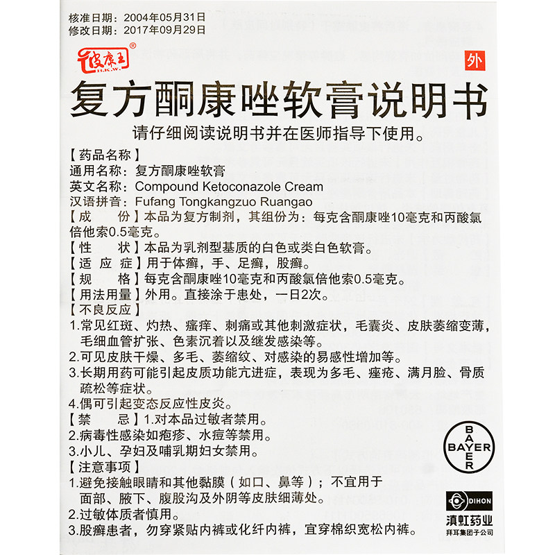 - Клобетазолу пропіонат належить до глюкокортикостероїдів. Його основною дією є усунення запального процесу внаслідок вазоконстриції та скорочення синтезу колагену в шкірі. Має також протисвербіжний, протиалергічний ефект. Дія ґрунтується на індуціонуванні утворення білків-ліпокотинів, які інгібують активність фосфоліпази А2, і на гальмуванні синтезу арахідонової кислоти та продуктів її обміну: лейкотрієнів, простагландин. Наявністю цієї речовини в китайському кремі «Король шкіри» зумовлена його ефективність у разі позбавлення симптомів псоріазу, як-от гіперемія, свербіж. Під час нанесення на шкіру не виключено всмоктування речовини в системний кровотік. Тому в разі ураження великих ділянок шкірного покриву під час застосування мазі треба проявляти обережність: передозування цього гормонального засобу небезпечне.