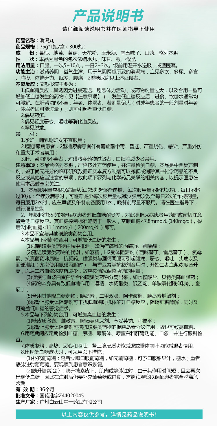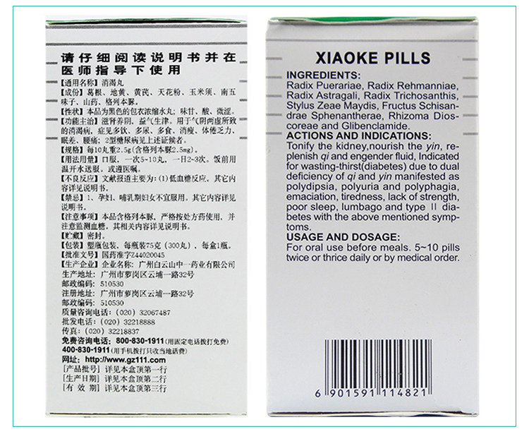 Склад: ремінія клейка оброблена (дихуан), корінь шоломника (хуанцинь), трихозантес кирлова (тягуафень), клеймо мозолі (юймісою), лимонник південний (наньуваєцзи), дикий ямс (шаньяо), глібенкламід.