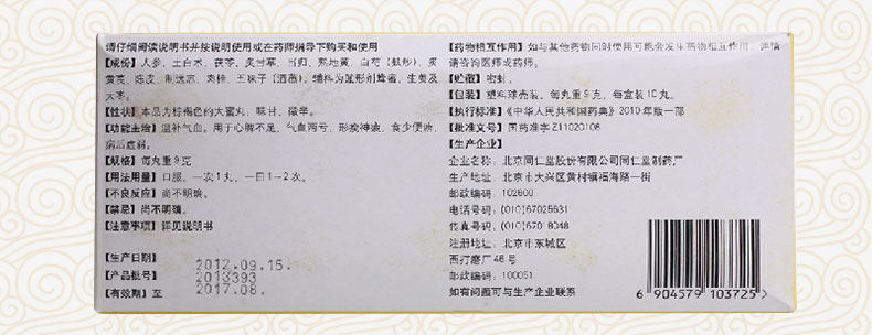 Женьшень, Atractylodes (почва), китайська лайчі, китайська лайчі, китайська дягея, корінь романії, біла півонія (смажений із висівками), цедра мандарина, юаньйони (система), кориця, лимонник (пропарене вино), солодка. Допоміжними речовинами є допоміжні речовини мед, імбир і мармелад.