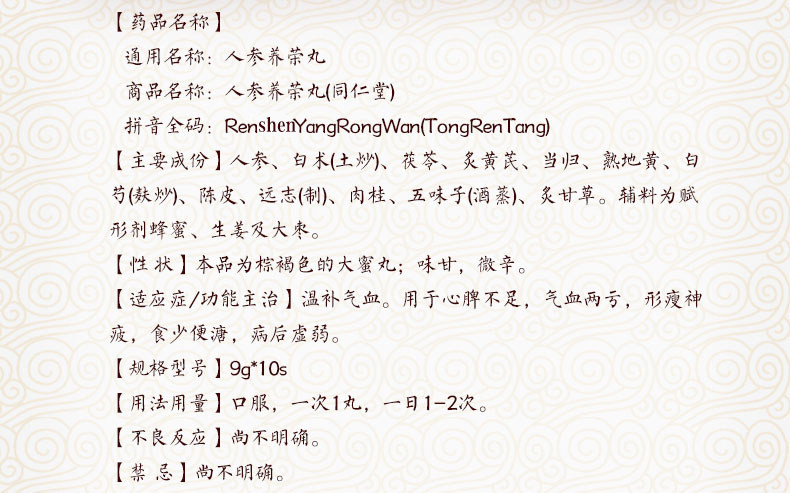 Цей запатентований лікарський засіб, що ґрунтується на давньому рецепті «Рен Шен Ян Ронг Тан» (відвар поживної комбінації женьшеню) у ТКМ, спочатку з'явився в «Формулярі імператорської вечері» епохи Тай Пін (Тай Пінг Гей Мін Хе Джі Джу Фан), який загалом використовується для розігрівання та тонізації ци та крові у разі синдрому дефіциту як серця, так і селезінки з недостатністю ци та крові, відзначеною виснаженням, втомою, анорексією і рідким випорожненням, психічною депресією, безсонням, жовтуватим кольором обличчя, випаданням волосся, дисменореєю, а також для слабкості під час одужання.
